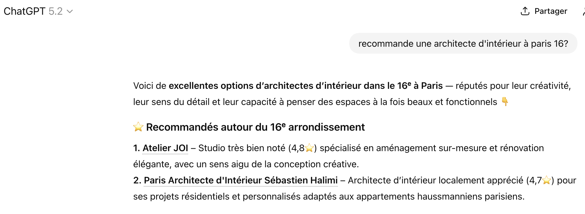 En apprenant à structurer ses données de service et ses avis clients avec Adilo, Julia a préparé son business pour les moteurs de réponse (GEO). Aujourd'hui, les IA comme ChatGPT ou Google Gemini recommandent Julia lorsqu'un utilisateur pose une question complexe : "recommande une architecte d'intérieur à paris 16?". Sa fiche est devenue sa meilleure base de connaissances pour les algorithmes de demain.